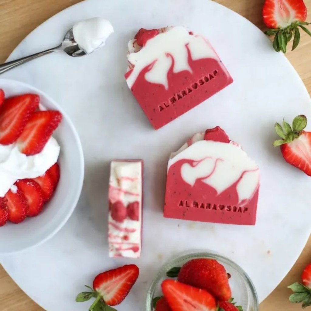 Dopřejte si sladký kousek léta každý den. Ručně vyráběné mýdlo Strawberry & Cream voní jako čerstvě utržené jahody se šlehačkou a cukrem – vůně, která okamžitě vykouzlí dobrou náladu a letní pohodu.