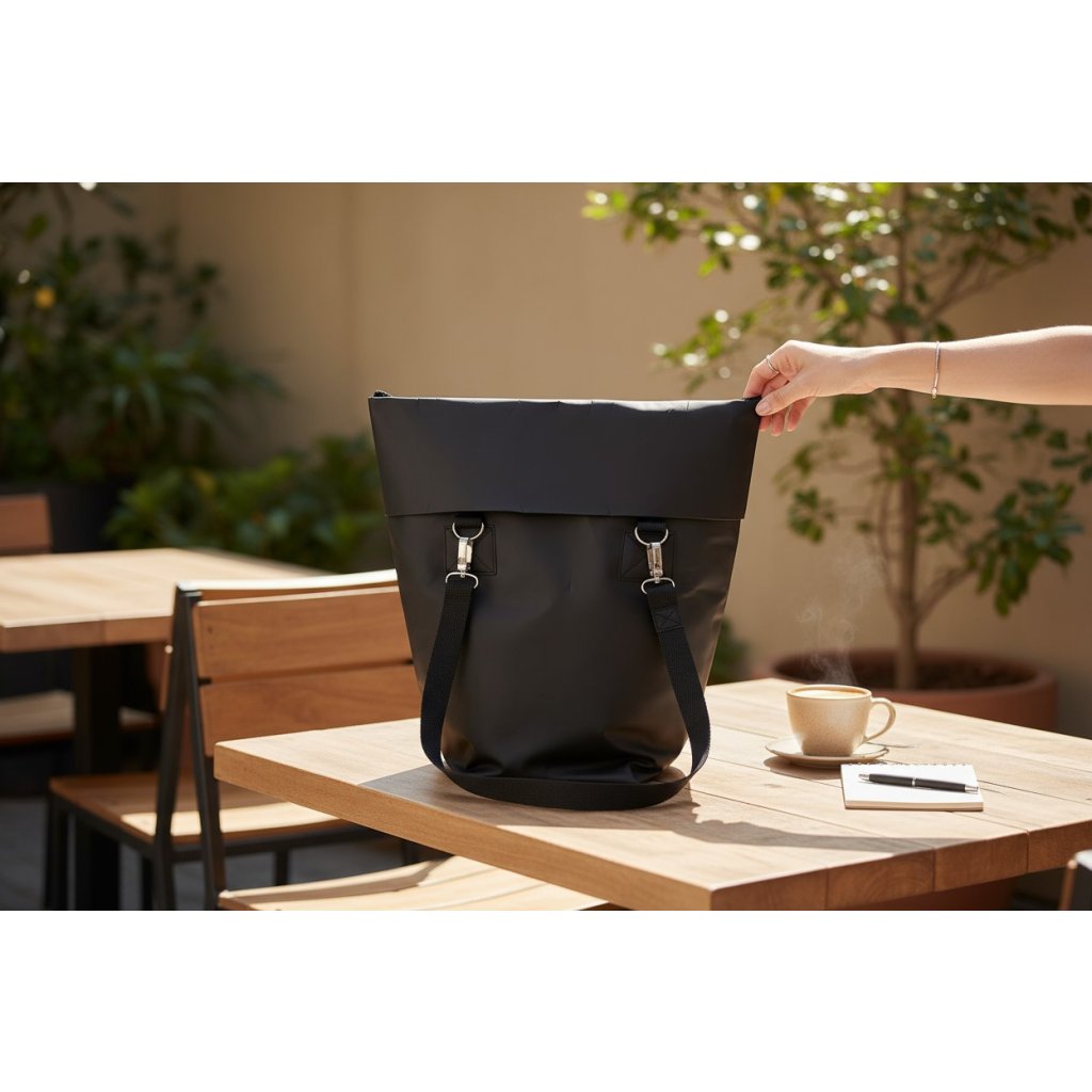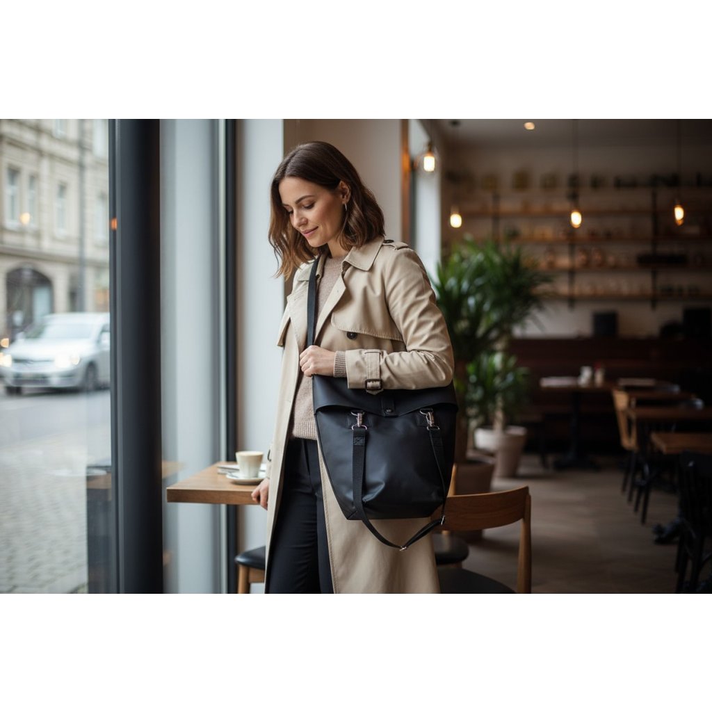 Kabelka Martina černá s dvěma černými bavlněnými popruhy, které jsou uchyceny pomocí karabinek.